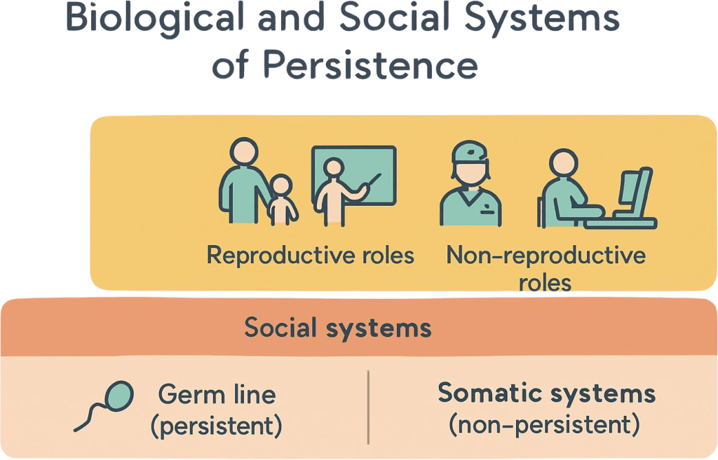 This dual reality raises several questions. What exactly is the relation between individual bodies, sex, and species‑level persistence? How do biological systems embed both reproductive and non‑reproductive components into coherent wholes? And how do societies assemble “non‑persistent” lives and roles—those that do not extend themselves genetically—into structures that still contribute to long‑term survival and meaning? This paper proposes a framework for thinking about these questions, distinguishing between biological persistence and broader forms of generativity, and arguing that non‑persistent systems are integral rather than peripheral to the human story (Erikson, 1963; Sober & Wilson, 1998).